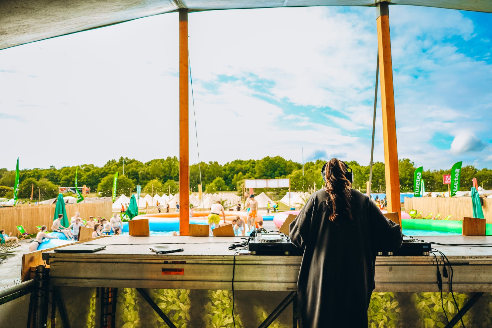 Van 16u tot 19u draaiden ze een energieke mix van zomerse beats, festival bangers en hun eigen stijlen. Het publiek aan het zwembad ging los zonnebrillen op, slippers uit.